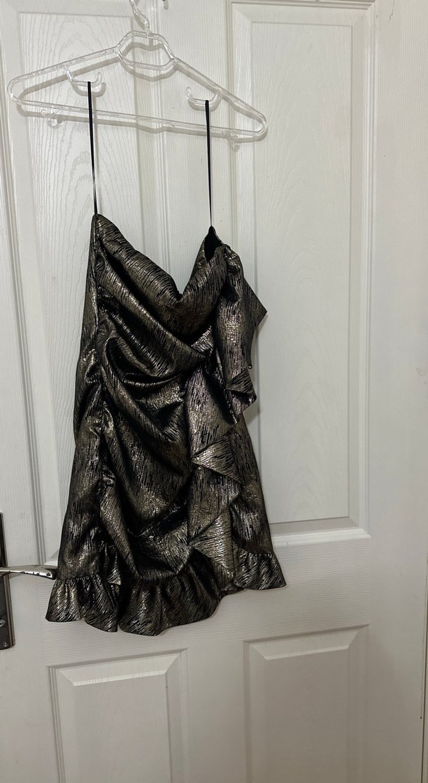 Sarı Simli fırfırlı Drapeli Mini Abiye Elbise