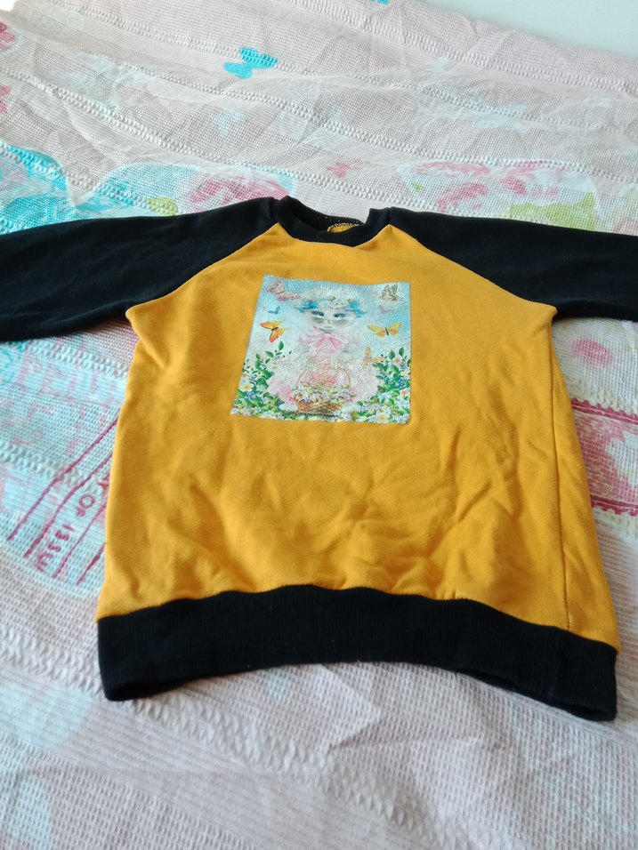 Yuvarlak yakalı, uzun kollu, bol kesim kız sweatshirtü. Dokuma kumaştan örülmüş, önünde baskılı desen, koyu sarı ve siyah renklerde. ön kısmındaki resimde hafif bozulma var