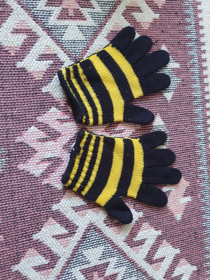Yumuşak örme kumaştan, renkli sarı ve siyah çizgili erkek çocuk eldivenleri.