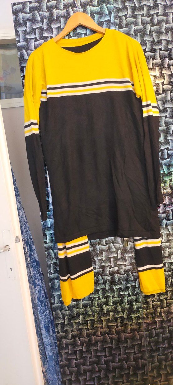 Uzun kollu, bol kesim ve bisiklet yaka erkek pijama takımı. Sarı ve koyu renklerde çizgili, triko kumaştan üretilmiştir. Rahat ve şık bir görünüm sunar.