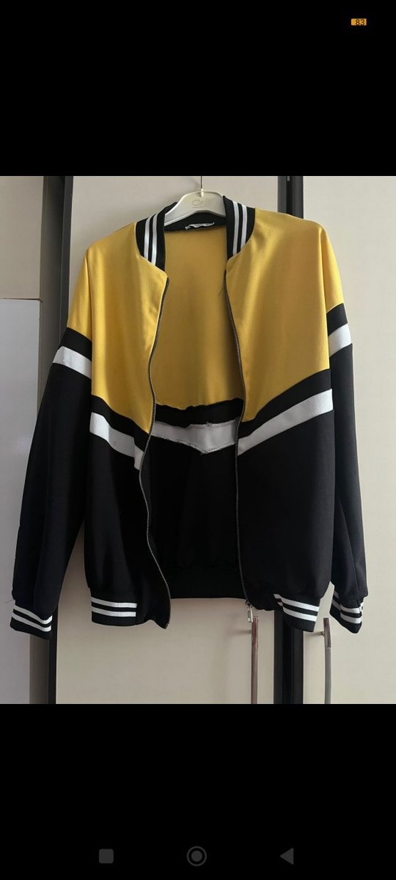 Kadın ceket, bol kesim, uzun kollu ve yüksek yakalıdır. Koyu sarı ve siyah çizgili tasarıma sahip, fermuarlı ve sentetik kumaştan üretilmiştir. Günlük kullanıma uygundur.