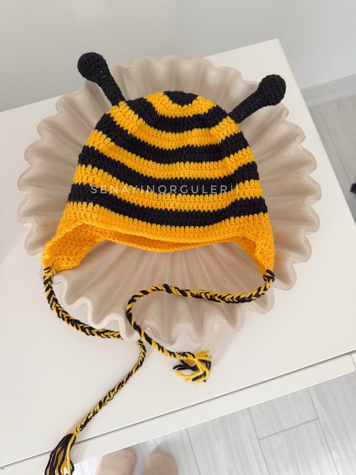 Sarı ve siyah çizgili, örgü çocuk bere. Oyuncu anten detayları ve örgülü bağcıklarıyla renkli, retro tarzı yansıtır.
