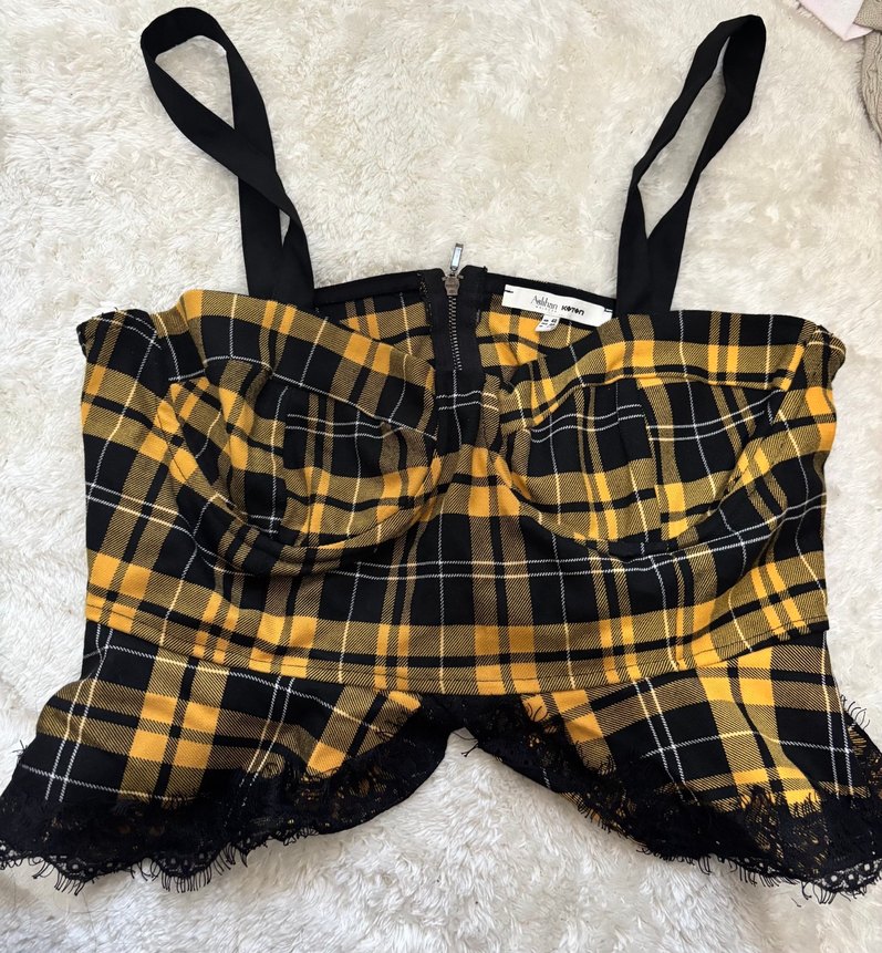 Sarı siyah ekose desenli, askılı, tokalı ve dantelli detaylı, sentetik kumaştan yapılmış, vücuda oturan bustiyer. Cesur grunge punk tarzı için uygundur.