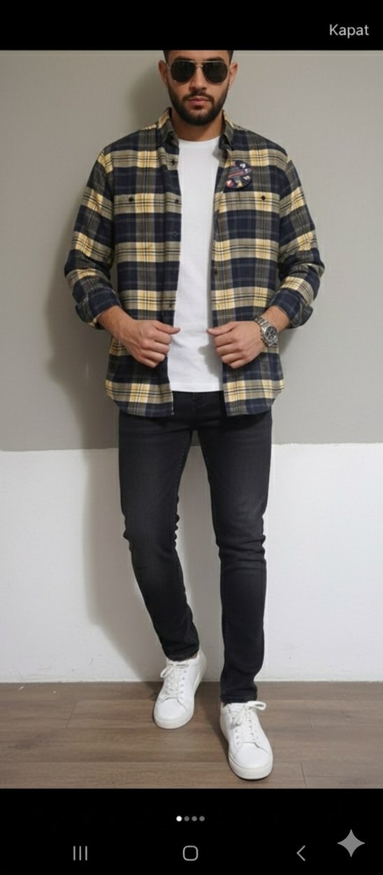 Uzun kollu, düğmeli, notalı yakalı, bol kesim, sarı siyah ekose desenli erkek gömleği. Tekstil malzemeden, rahat sokak stili için uygundur.