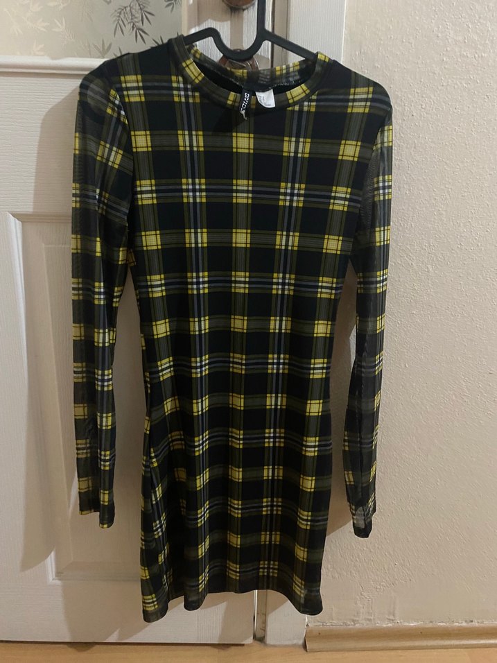 Sarı siyah ekose desenli, uzun kollu, yüksek yakalı ve düğmeli detaylı, vücuda oturan midi elbise. Grunge punk stilini yansıtır.