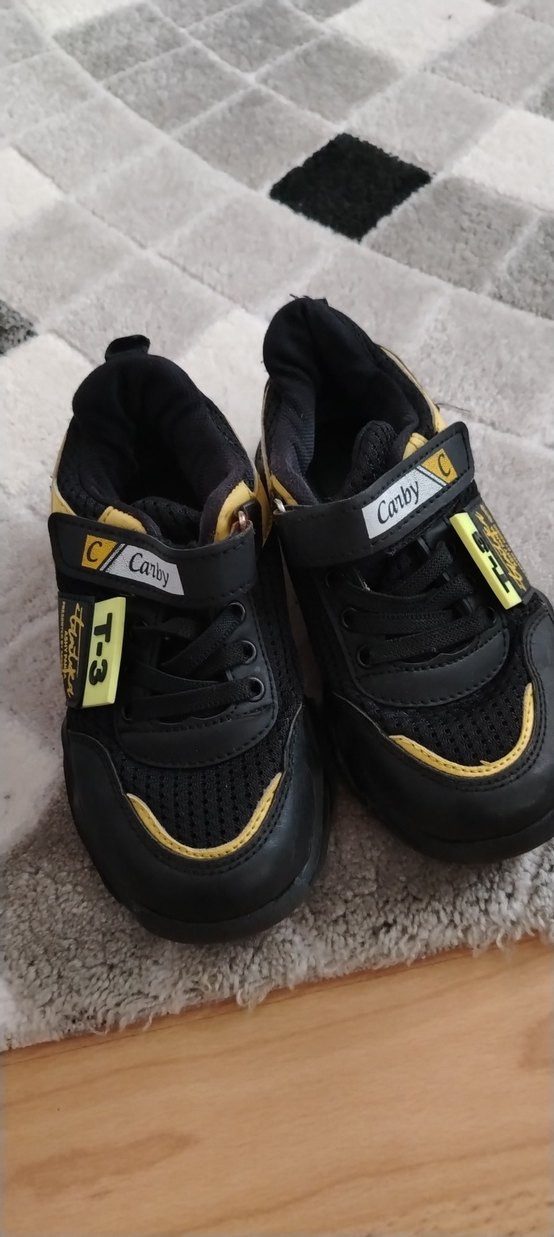 Koyu sarı ve siyah renkli, baskılı desenli erkek çocuk spor ayakkabısı. Kauçuk tabanlı ve Velcro kapamalı, üzerinde "T-3" etiketi bulunur.