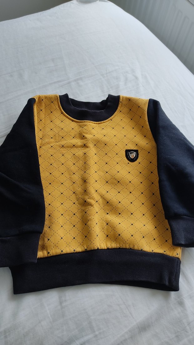 Bu dar kesim erkek çocuk sweatshirtü, baskılı desene sahip koyu sarı örme ön yüzü ve siyah uzun kollara sahiptir. Yuvarlak yaka ve yumuşak, sıcak kumaş kullanılmıştır.