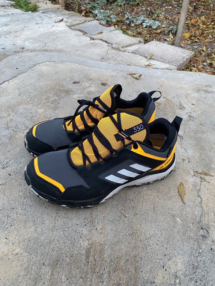 Sarı ve siyah renklerde, baskılı detaylara sahip erkek outdoor spor ayakkabısı. Kauçuk tabanlı ve cırt cırtlı, sokak stili ve outdoor aktiviteler için uygun.