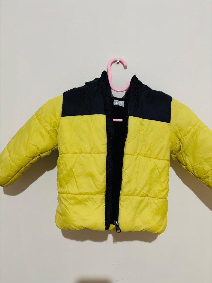 Fermuarlı ve yakalı, dar kesim erkek çocuk montu. Koyu sarı ve siyah renklerde, sıcak ve yumuşak dokulu, sokak stili için uygundur. 2 yaş