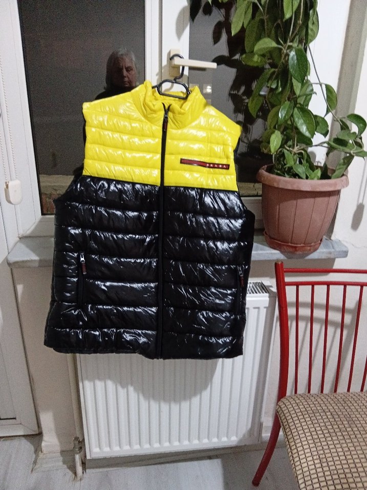 Sarı ve siyah renklerde, fermuarlı ve midi boy, kolsuz şişme yelek. Dar kesim ve bisiklet yaka detaylarıyla sokak stiline uygun. sadece prada yazan seritin ucu kesilmiş fermuarı kapatırken olmuş olabilir uygun tutuyorum