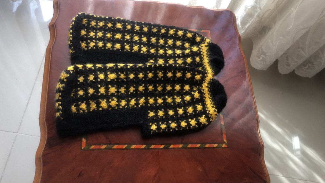 Koyu sarı ve siyah kareli örme desene sahip, mutfakta ısıya karşı koruma sağlayan fırın eldiveni.