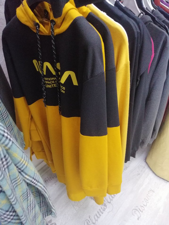 Kadınlar için uzun kollu, yuvarlak yakalı, bol kesim sweatshirt. Koyu sarı ve siyah renk bloklu, yumuşak kumaş, baskılı ve cırt cırt detaylı. Günlük kullanıma uygun.