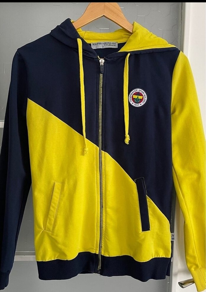 Fermuarlı ve kapüşonlu, sarı ve siyah renk bloklu, yumuşak kumaştan erkek sweatshirt. Uzun kollu ve baskılı logolu, spor ve gündelik kullanıma uygun.