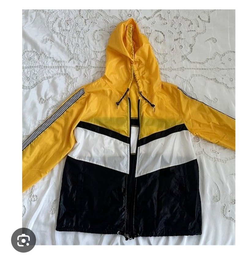 Parlak sarı kapüşonlu, uzun kollu, fermuarlı kadın spor ceket. Gevşek kesimli, sarı, beyaz ve siyah renk bloklu tasarım. Koton çok şık sportif ürün. yepyenidir, deforme yoktur.
