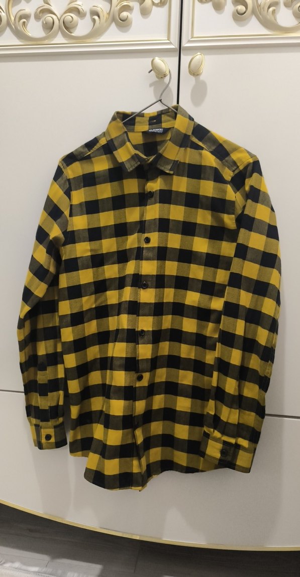 Sarı siyah kareli, düğmeli erkek gömleği. Uzun kollu, yakalı ve bol kesim, sentetik kumaştan, günlük rahat stil için uygundur.