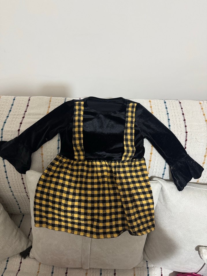 Sarı siyah kareli desene sahip, uzun kollu ve fırfırlı detaylı, gotik tarzda, vücuda oturan kız elbisesi.