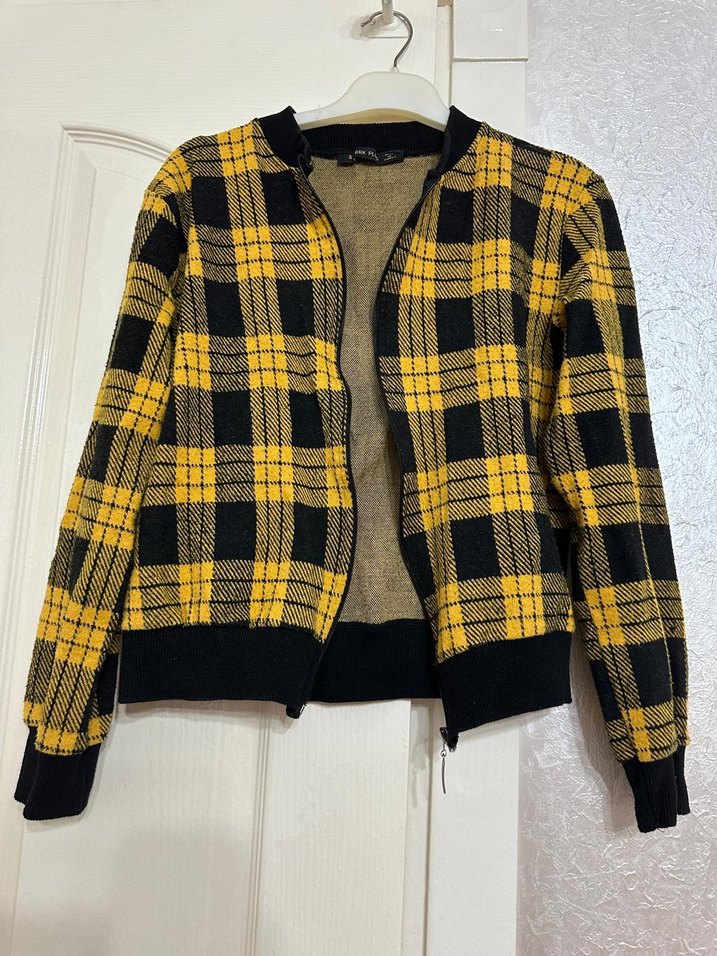 Düğmeli, uzun kollu, yün kumaştan yapılmış, sarı siyah kareli, normal boyda, dar kesim kadın ceketi. Notch yakalı ve günlük kullanıma uygun.
