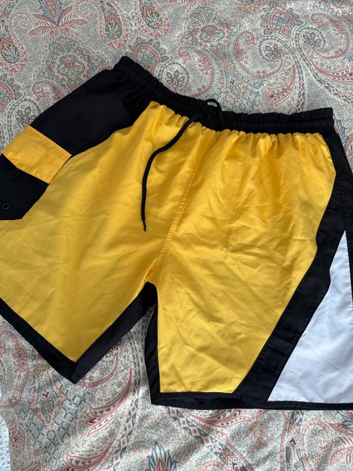 Sarı, siyah ve beyaz detaylı, kemerli, bol kesim erkek mini şort. Spor ve sokak modasına uygun kısa boyda.