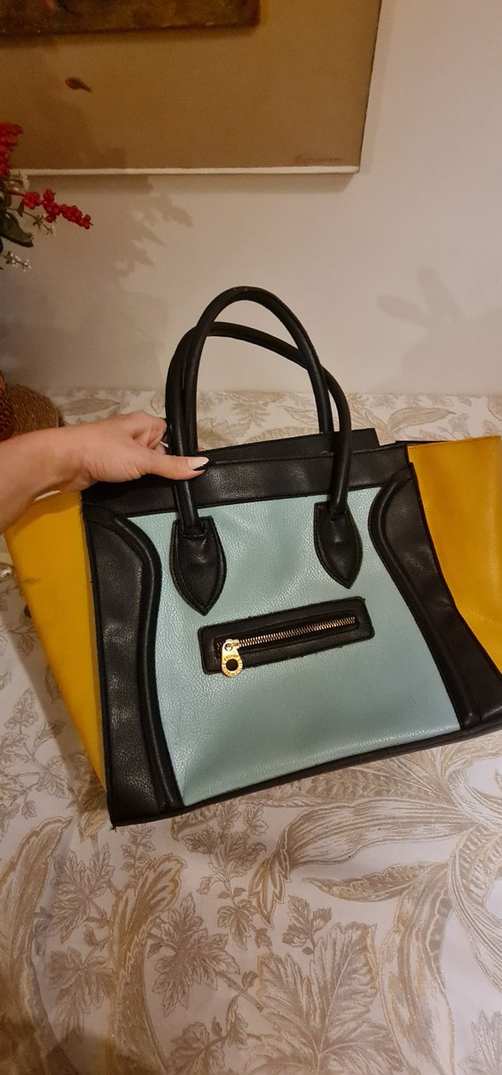 Sarı ve siyah deri kombinasyonlu, fermuarlı cepli, pastel tonlarda kadın çantası. Günlük kullanıma uygun, çağdaş ve trend bir tasarım.