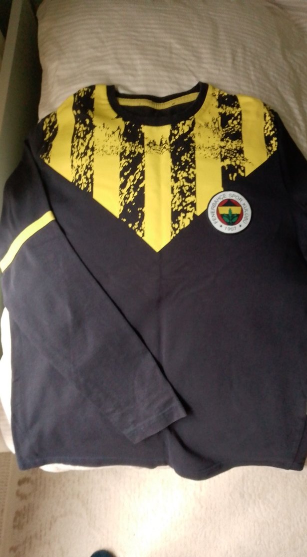 Yuvarlak yakalı, düğmeli detaylı, uzun kollu erkek spor tişörtü. Sarı ve siyah baskılı, bol kesim, sentetik kumaşla sportif ve rahat bir görünüm sunar. boy 65 beden 50 cm
