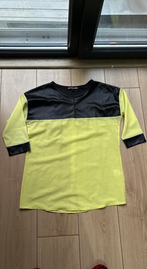 Sarı ve siyah renk bloklu, uzun kollu ve yuvarlak yakalı, bol kesim bluz. Yumuşak sentetik kumaştan üretilmiş, rahat bir sokak stili sunar.