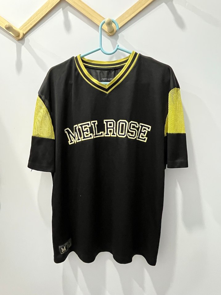 Sarı ve siyah renkli, kısa kollu, V yakalı ve bol kesim erkek spor tişörtü. Sentetik kumaştan, "MELROSE" baskılı ve cırt cırt detaylı.