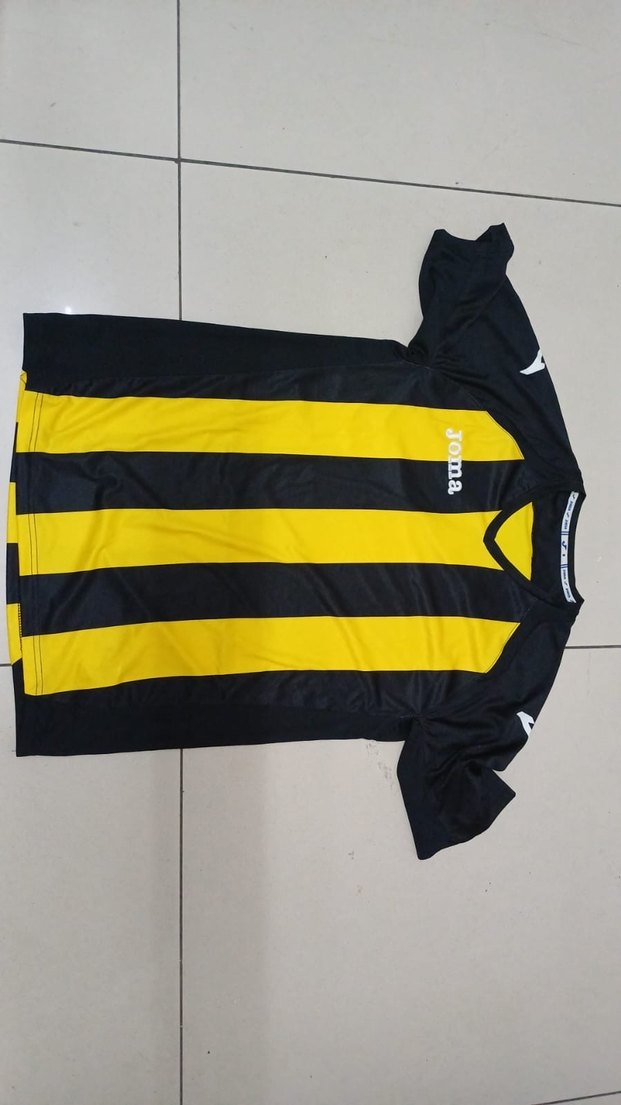 V-yaka ve kısa kollu, sarı siyah çizgili, sentetik kumaştan üretilmiş, fitted kesim erkek spor tişörtü. Velcro detayları ile sportif ve sokak stiline uygun. ♂️