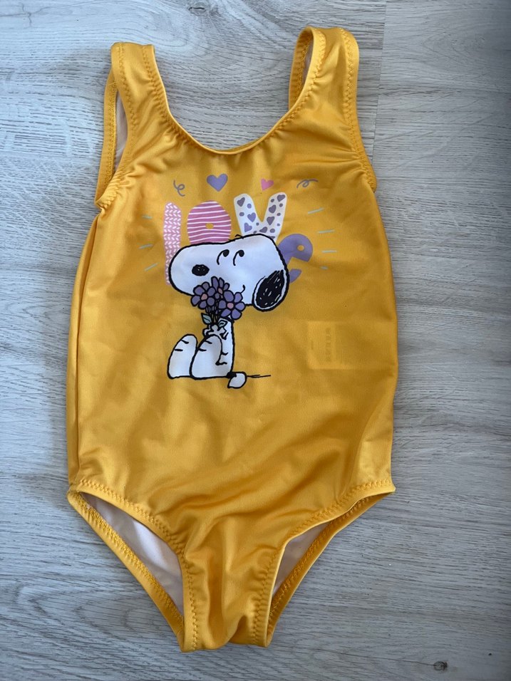 Kolsuz, sarı mayo, renkli Snoopy baskılıdır. Plajda kullanıma uygun, yumuşak ve rahat kumaşlıdır.