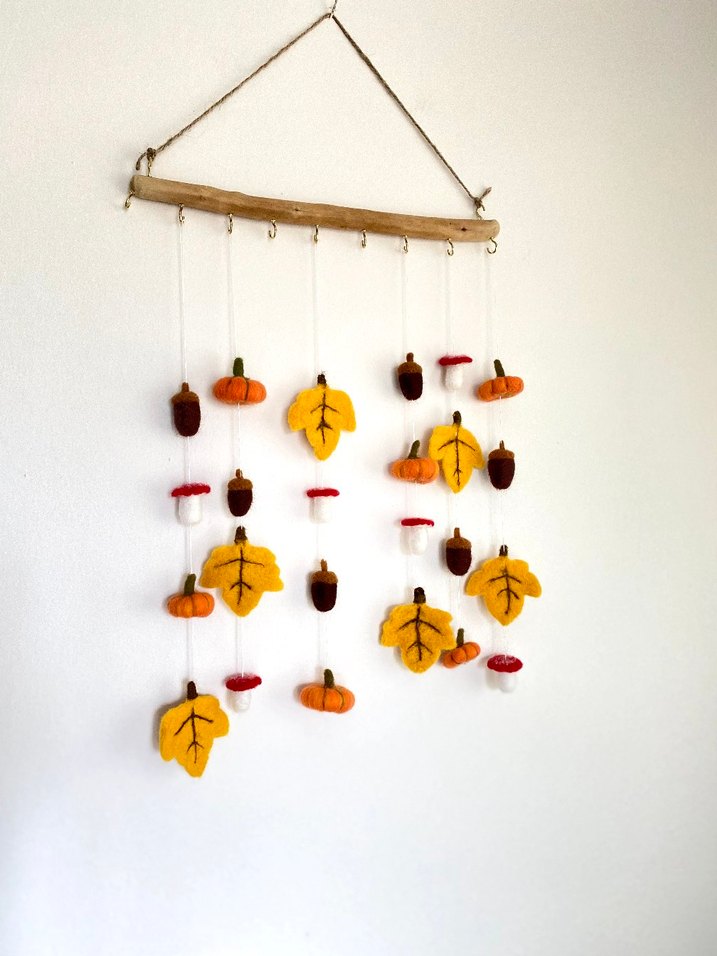 Sonbahar dekorasyonu, bebek beşiği dönencesi yada rüzgar gülü olarak kullanılabilir. Sadece keçe figürler satılıktır aparatları satılık değil .