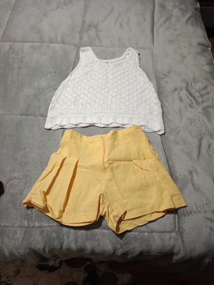 4-5 yaş uyumlu temız kombın Beyaz örgü kolsuz üst ve açık sarı şorttan oluşan bebek kız takımı. Üst desensiz ve zarif örgü detaylı, şort ise yumuşak kumaştan. #etek #bluz #altüsttakım