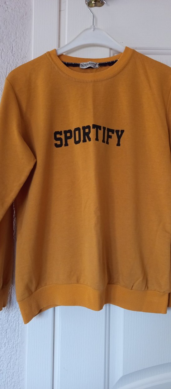 Sarı renkli, uzun kollu, yuvarlak yakalı, bol kesim kadın sweatshirt. Örme dokusu ve parlak yüzeyi vardır. Önünde 'SPORTIFY' baskısı bulunur.