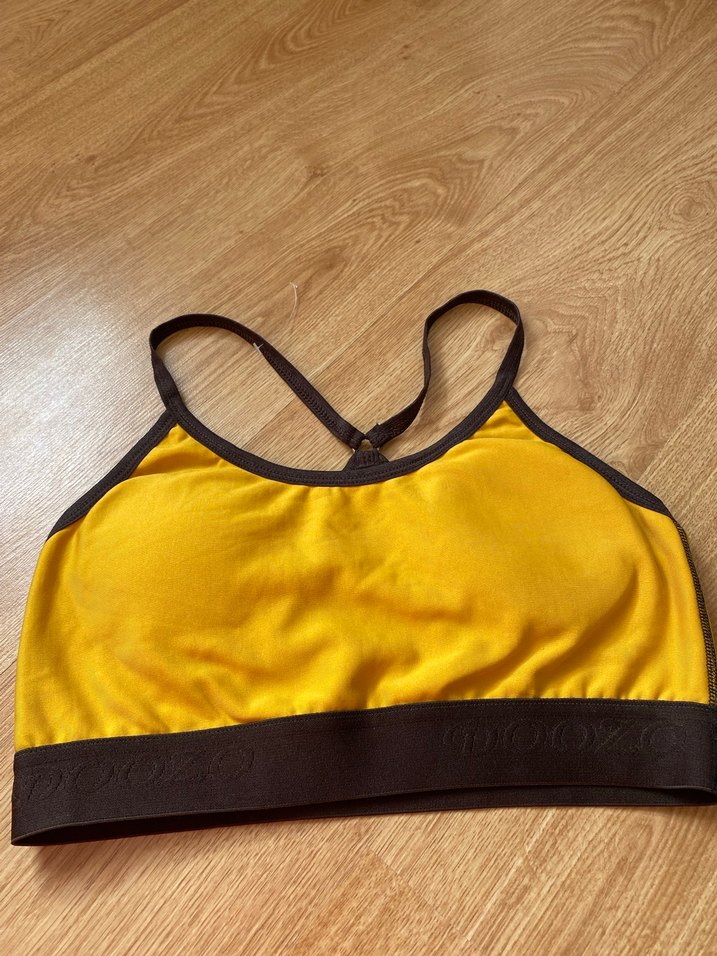 Koyu kenarlı sarı spor sütyeni, normal boyda ve streetwear tarzında, rahat athleisure kullanımı için uygun. ️