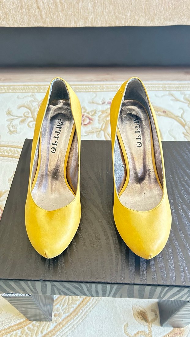 sarı renkte, stiletto topuklu ayakkabılar. Vintage tarzı modern klasik zarafetle buluşturuyor. Romantik akşamlar için ideal. Topuk boyu 10 cm küçük defoları va giyime engel değil dolap bekledi bir kez giyildi makul teklifler kabul