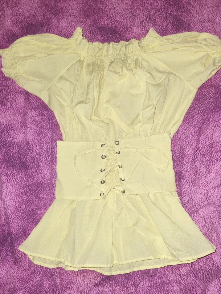 Sarı straplez, düğmeli ve askılı kollu bohem tarzda, vücuda oturan vintage bluz. Yumuşak sentetik kumaştan, parti için uygun.