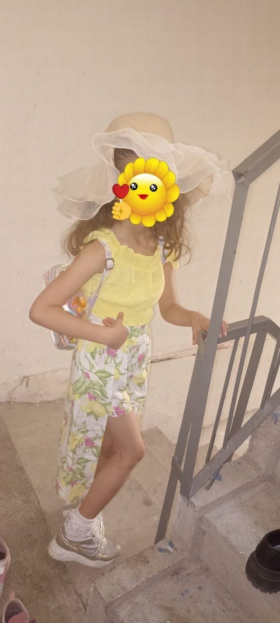 Sarı, straplez ve fırfırlı, bol kesim kız elbisesi. Tie-dye deseniyle bohem tarzı yansıtıyor.