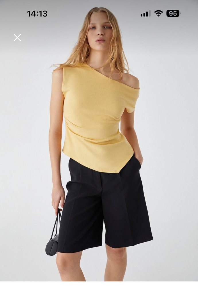 Sarı straplez bluz, ipeksi kumaş ve regular fit kesimiyle günlük kullanıma uygun minimal ve çağdaş bir tasarıma sahiptir.