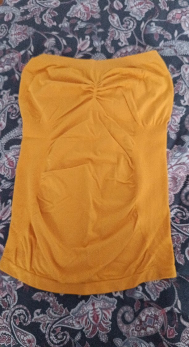 Sarı renkli, straplez, drapeli ve vücuda oturan midi uzunlukta, kolsuz korse atlet. Günlük sokak ve athleisure tarzına uygun.