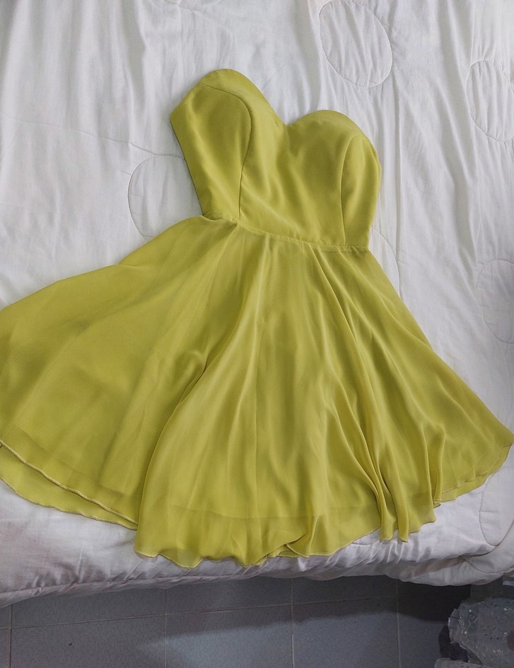 Sarı straplez abiye elbise, drapeli ve vücuda oturan kesime sahiptir. Kolsuz ve parlak dokusuyla parti için uygundur. Modern klasik ve vintage tarzda.arkası ipli