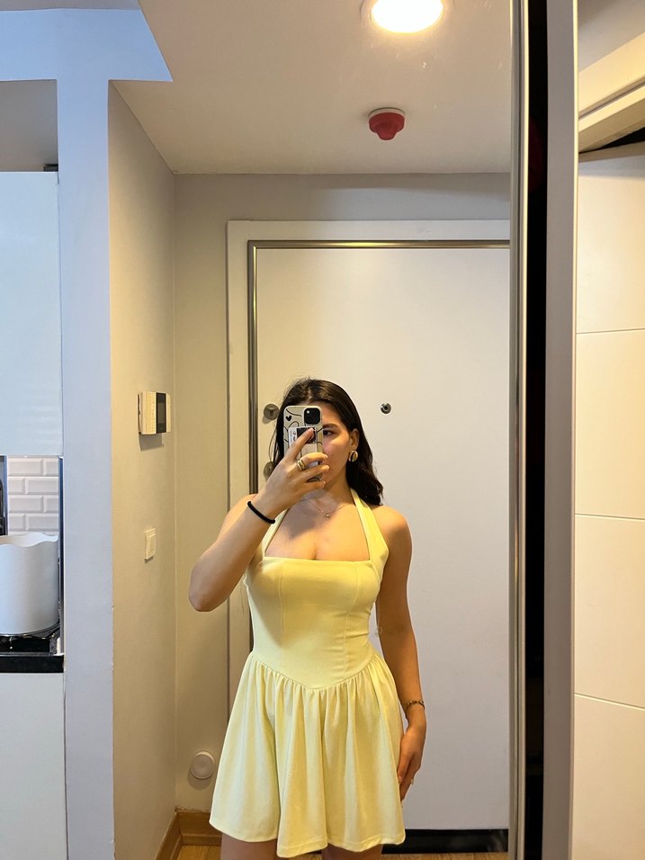 Sarı, straplez, midi uzunlukta ve düz desenli bu kadın elbise, satenimsi kumaşı ve kolsuz tasarımıyla rahat ve şık bir görünüm sunar. Parti için uygundur.