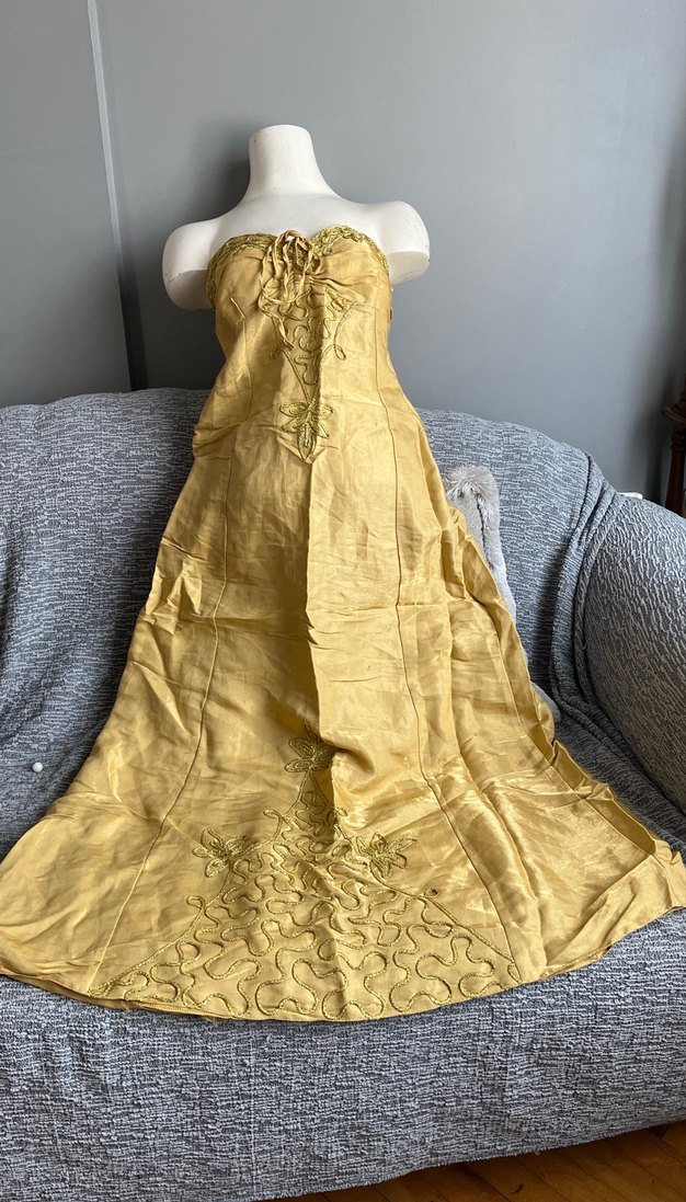 Sarı straplez uzun elbise nakışlı detaylar ve salaş kesimle bohem stil sunar, düğünler için uygundur.Üyüsüz fotoğraflandı