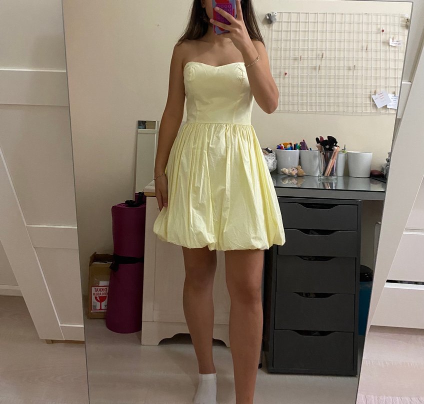 Pastel sarı, straplez, vücuda oturan üst kısmı ve piliseli etek detaylarıyla, kolsuz ve normcore tarzda romantik akşamlar için uygun bir mezuniyet elbisesi. Arka kısmında lastikler mevcut çok hafif bir elbise, hiç kullanılmadı.