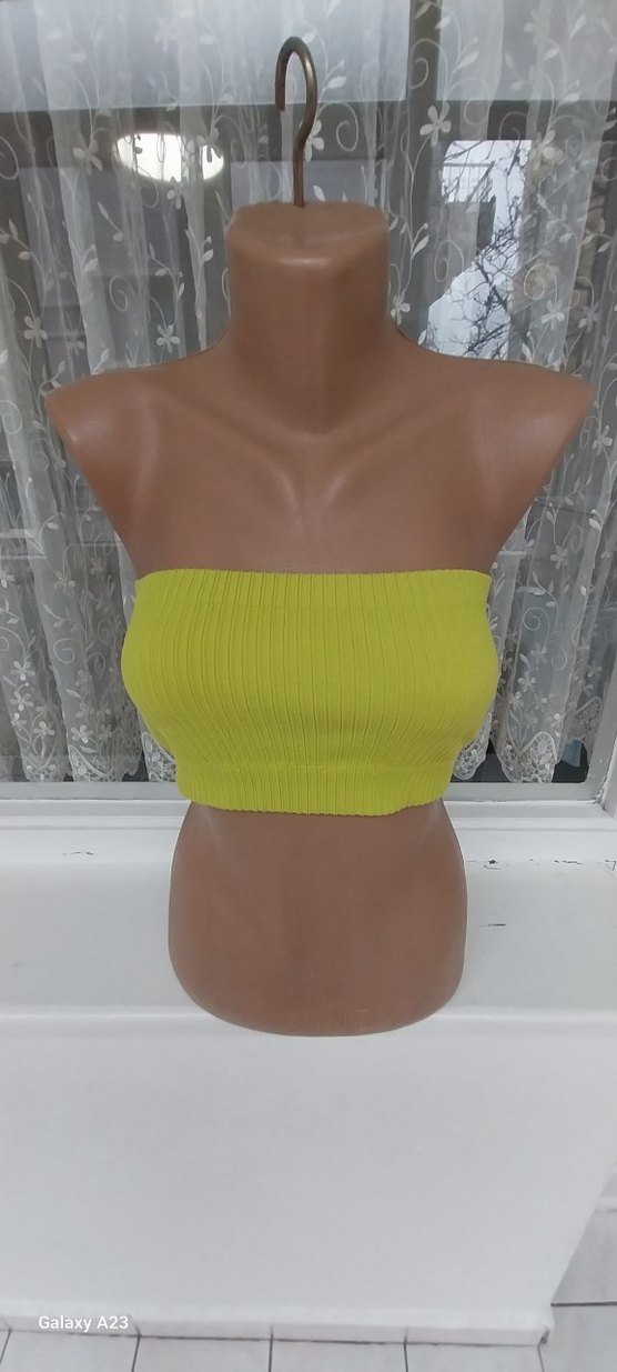 Bu sarı straplez bustiyer, yumuşak ve örme triko kumaştan yapılmıştır. Kısa boylu, rahat ve cesur tarzda, günlük kullanım için uygundur. marka 3