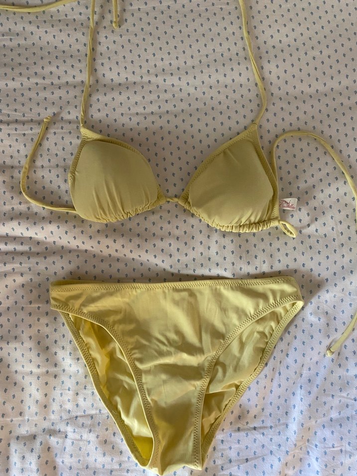 Sarı, strappy detaylı, vücuda oturan bikini takımıdır. Minimalist ve bohem tarzıyla plaj için uygundur. Hafif, desensiz kumaştan yapılmıştır.