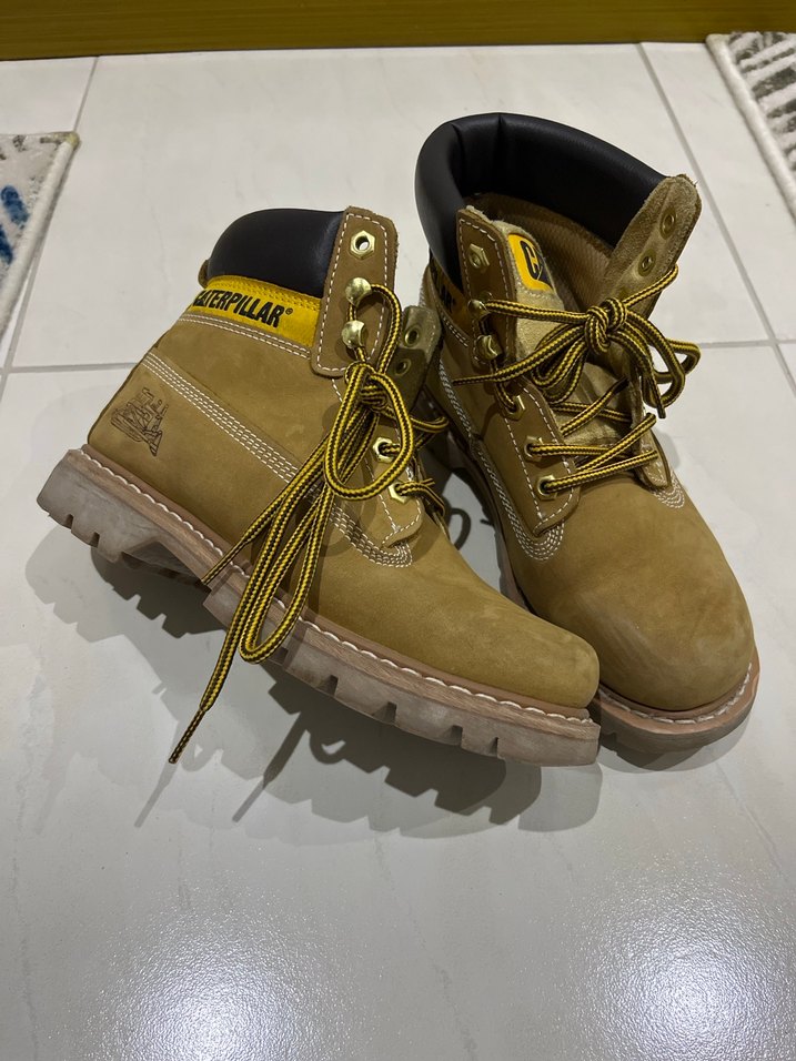 Sarı süet malzemeden yapılmış ve bağcıklı kadın botları. Günlük kullanım için uygun, sokak stiline uyum sağlar.