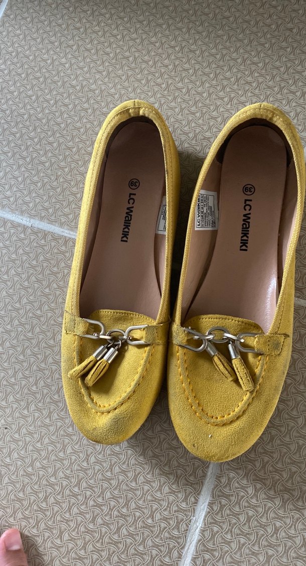 Sarı süet malzemeden, dolgu topuklu ve tokalı püskül detaylı kadın babetler. Günlük kullanıma uygun, rahat ve şık.
