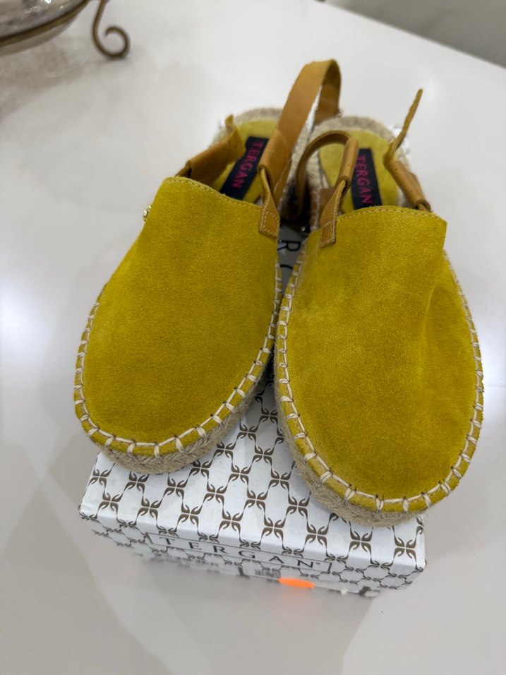 Sarı süet espadriller, ve renkli nakış detaylı, cırt cırtlı kayışla bohem tarzına uygundur.