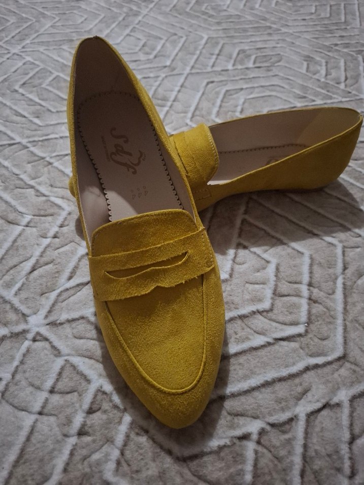 Sarı süet kadın babet. Günlük kullanıma uygun, parlak ve minimalist modern tarzda şık bir modeldir.