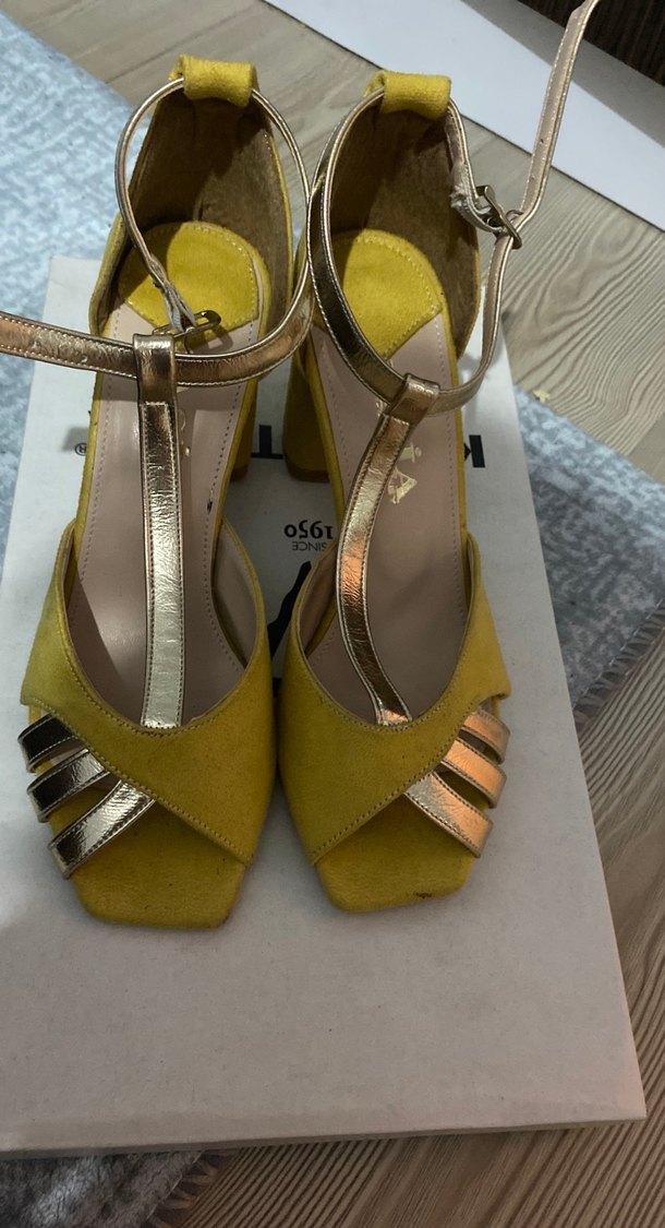 Sarı süet malzemeden, parlak metalik tokalı, baskılı desenli kadın topuklu sandalet. Romantik akşamlar için uygun.