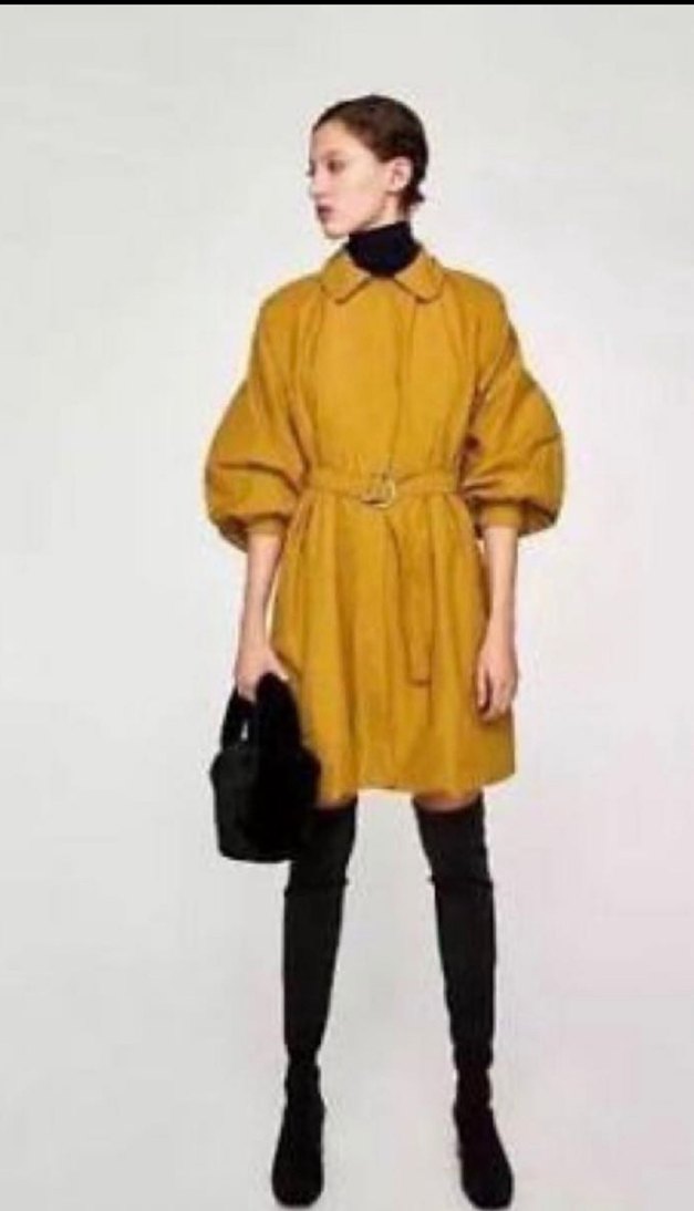 Sarı süet malzemeden yapılmış, yüksek yakalı ve uzun kollu, kemerli, salaş kesim midi kadın kaban.