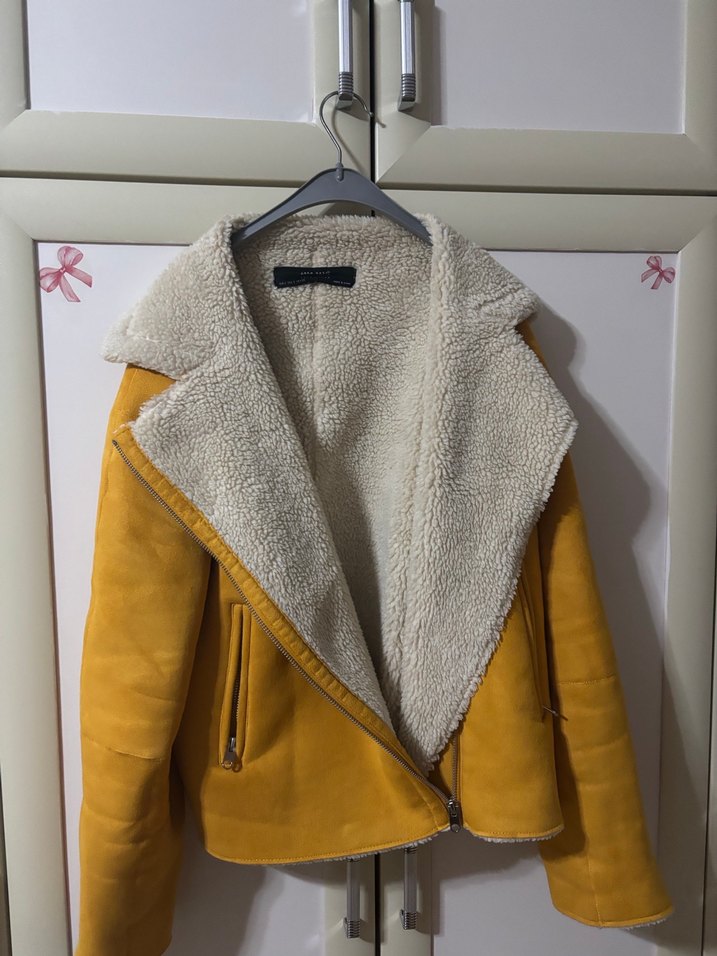 Sarı süet ceket, kürk detaylı ve yakalı. Strappy kollu, midi boy, vücuda oturan kesim. Günlük kullanıma uygun, sade ve rahat tarzda.